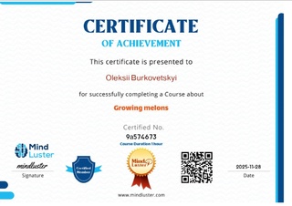 Аспірант кафедри овочівництва Бурковецький Олексій успішно завершив міжнародний навчальний курс “Growing Melons”, присвячений сучасним технологіям вирощування баштанних культур. Курс надає комплексні знання, необхідні для підвищення ефективності виробництва дині та інших баштанних культур у сучасних агротехнологічних умовах. Програма курсу включала такі ключові теми: